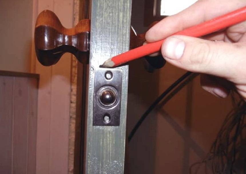 На последнем этапе при установке нашей дверной ручки нужно смонтировать ответную часть защелки в коробке. Чтобы все получилось, смазываем маслом язычок, закрываем дверь и делаем отметину на косяке язычком, делая уже собранной до этого момента дверной ручкой пару движений по типу «открыть-закрыть». Следом нужно приложить накладку, проворачиваемую к косяку, обвести ее по контуру вместе с внутренним отверстием.