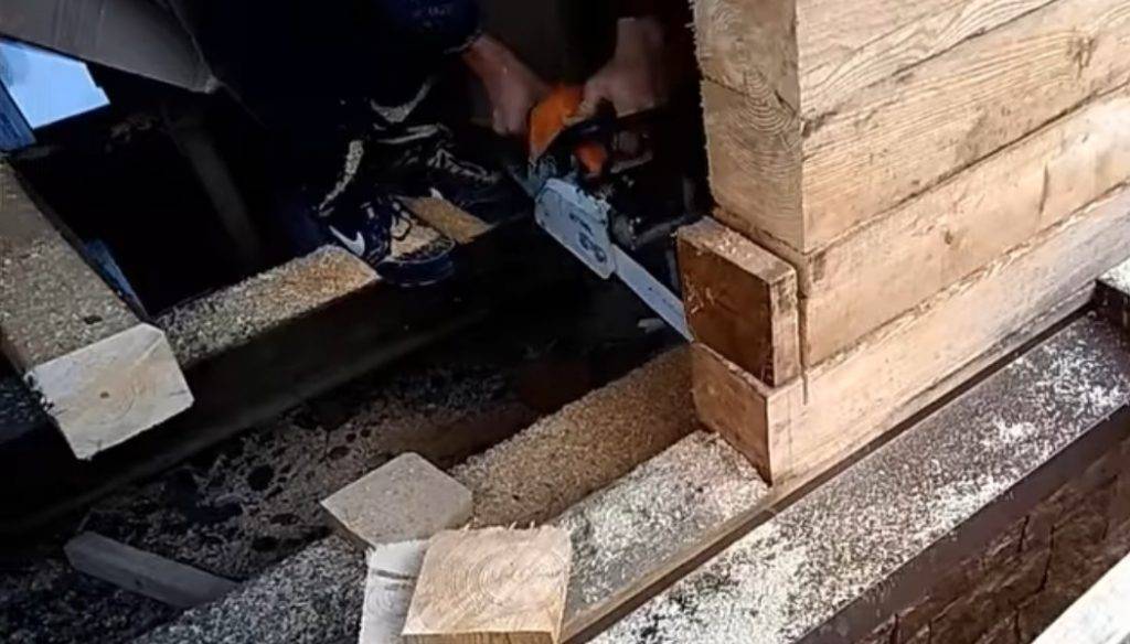 При выпиливании важно вверху и внизу оставить по половине толщины бревна или бруса. Убирают излишки древесины
