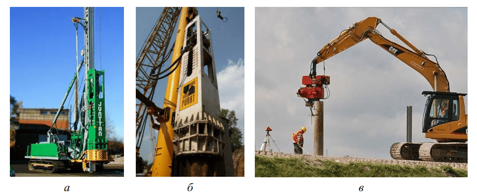 Копровые установки с навесным оборудованием: а — гидромолотом; б — вибропогружателем; в — вибропогружатель на базе экскаватора
