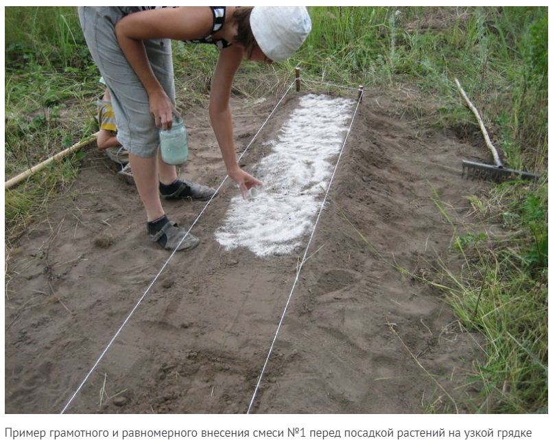 Пример грамотного и равномерного внесения смеси №1 перед посадкой растений на узкой грядке