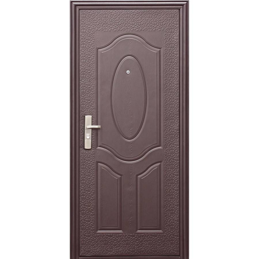 Для квартир и домов такой вариант не походит. Подобные металлические двери эконом монтируют в качестве «времянки» при строительстве или в подсобные помещения. Что касается толщины стального листа то он едва достигает в подобных дверях 1 мм. По взломостойкости эти изделия можно смело сравнивать с консервными банками. Чтобы полотно казалось жестким, используется уголок из непрочных сортов стали. Однако, несмотря на все минусы, такой вариант все же имеет право на жизнь.
