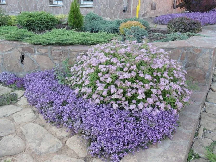 Спирея смотрится выигрышно в сочетании со многими растениями. Соседей выбирают исходя из размера, цвета, формы, времени цветения.