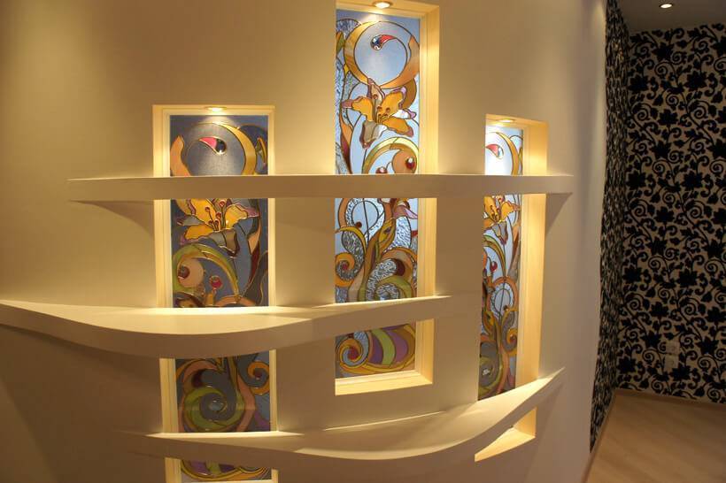 Формы повторяются, но использование непривычных материалов позволяет создать нечто неординарное. Помогут в этом и витражи. Внутренние стены ниш можно закрыть витражным экраном, за которым оборудована подсветка. Витражная ниша, сквозь которую льется свет, способна произвести впечатление.