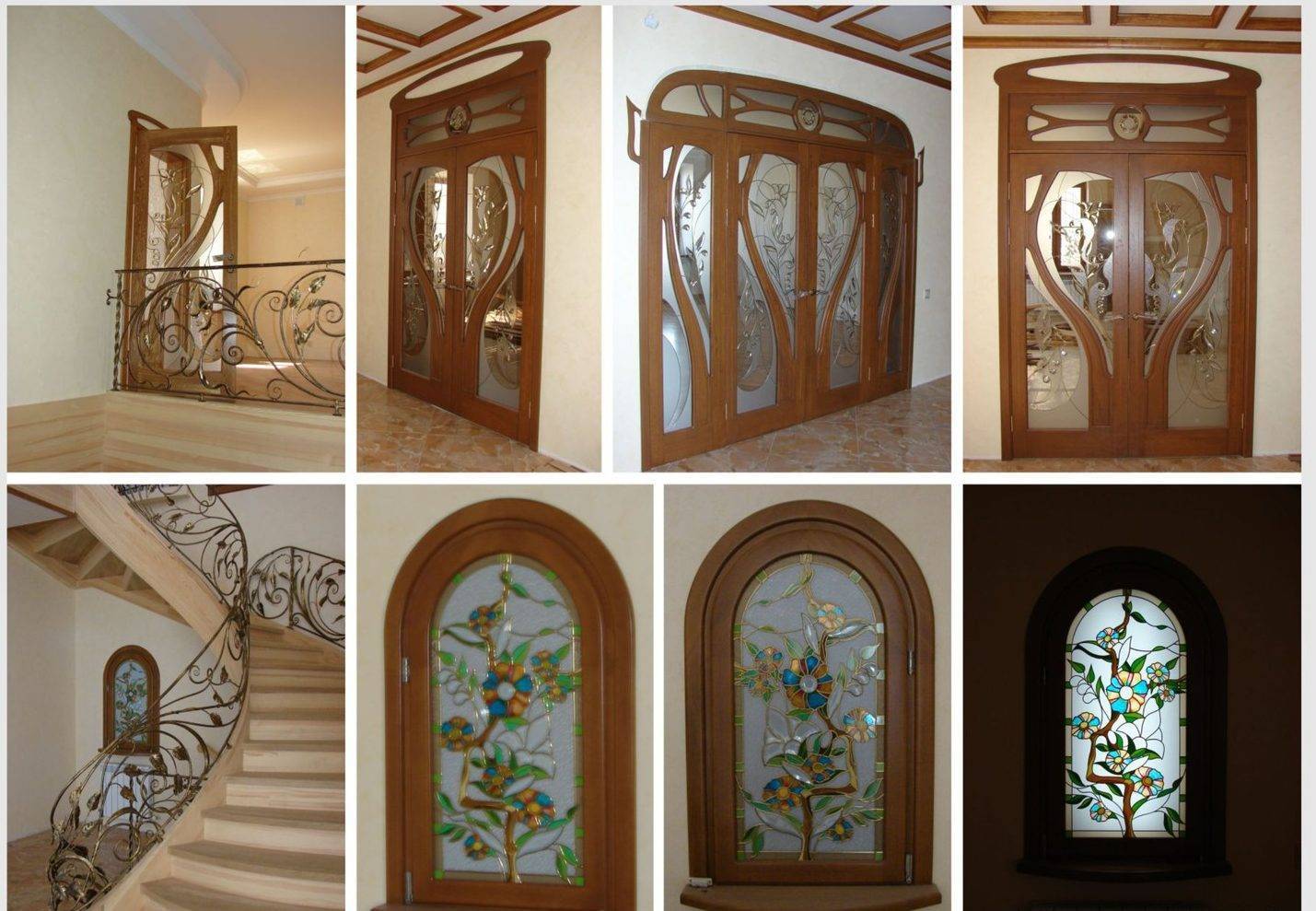 В изготовлении дверей в стиле модерн особенно выигрышны плавные линии и узоры в витражных вставках, художественные композиции.