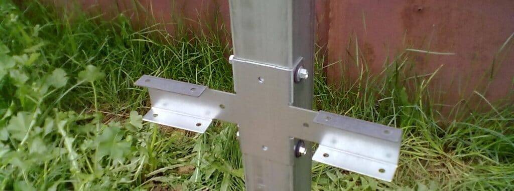 Для опор лучше выбирать металлические профили с сечением квадрат 60×60 мм, в длину не менее 2 м. Можно вместо профилей поставить трубы с равным диаметром. Дополнительный вариант брус, но у дерева высокие риски гниения, ему необходимо проведение в скором времени ремонтных работ.