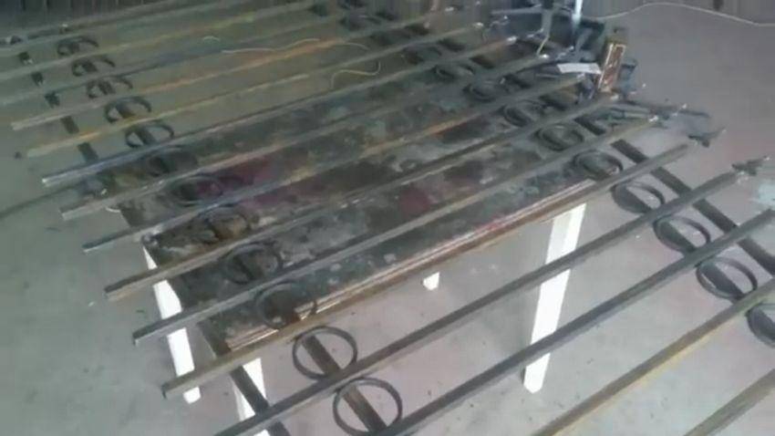 Шаг 4. Уложите заготовки параллельно на предварительно оборудованную раму с одинаковым шагом. В примере шаг регулируется металлическими кольцами – это не только полезно, но и украшает конструкцию. Приварите заготовки к раме.