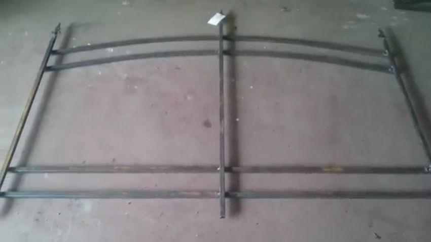 Шаг 1. Вначале изготовьте каркас рамы полотна. Возьмите 3 профильные трубы (в примере – с пиками на концах), уложите их параллельно друг другу. Они послужат в качестве вертикалей ворот.