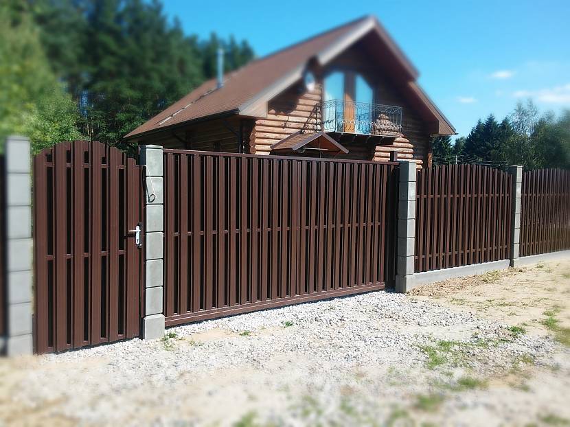 Ворота и забор во дворе из коричневого евроштакетникаИсточник mosstavni.ru
