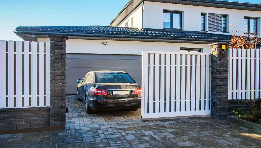 Это хорошее решение для небольших участков, однако некоторые домовладельцы отмечают, что внешний вид подъемных ворот плохо сочетается с оградой и придает участку “складской”, нежилой вид.
