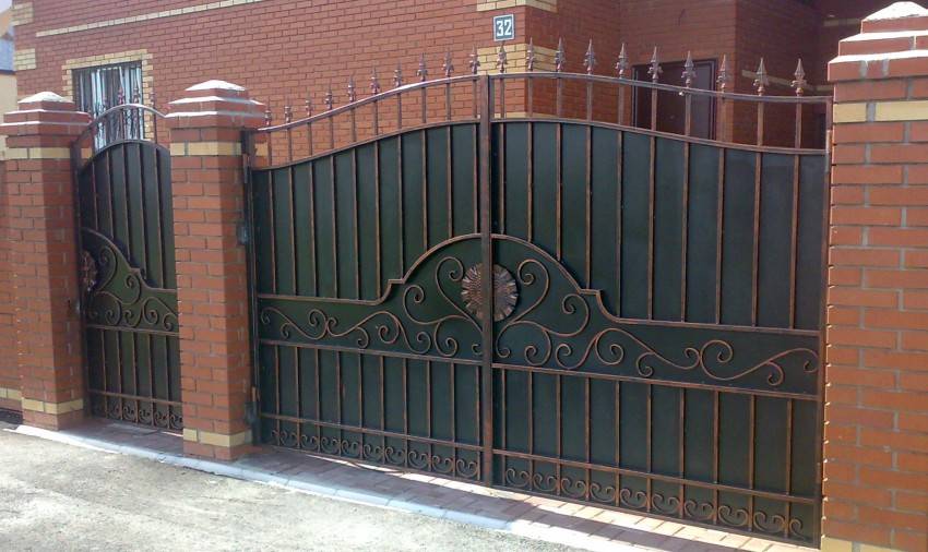 Распашные в сочетании с калиткой – классический вариант. Конструкция представлена двумя вертикальными опорами и петлями, на которых будут крепиться створки. Открываться такая конструкция может внутрь или наружу. Створки же состоят из металлической рамы, сваренной из профиля или трубы, а также из обрешетки. Последняя может быть изготовлена из дерева, металла, профнастила и других материалов. Чтобы закрывать распашные ворота, может применяться засов, препятствующий провисанию створок.