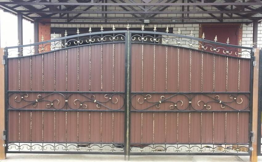 Наиболее часто распашные ворота своими руками изготавливаются из профлиста. Он представлен к продаже в широком ассортименте. Преимуществом данного подхода можно назвать то, что материал практически не придётся подготавливать. Отдельные секции можно спроектировать таким образом, чтобы готовый лист профилированного покрытия точно лёг между двумя столбами. Это позволит исключить необходимость окрашивания полотна, а также поможет сэкономить время.