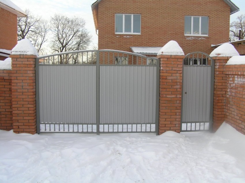 Главным недостатком в использовании распашной конструкции считается наличие свободного пространства для открытия створок. Особенно неудобно ей пользоваться во время зимнего периода, когда появляется необходимость расчищать снег, чтобы заехать или выехать во двор автотранспорту.