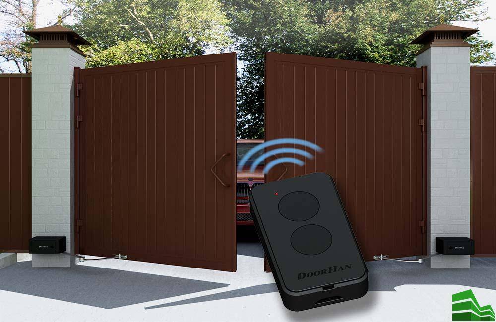Открывание въездной группы с помощью пульта автоматического управления, очень удобно. Оно позволяет управлять всей системой без необходимости покидать машину и подходить к створкам.