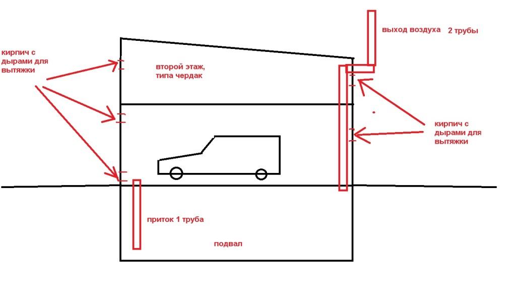 Вытяжка в гараже схема представлена ниже. Здесь изображен сам принцип подачи воздуха.