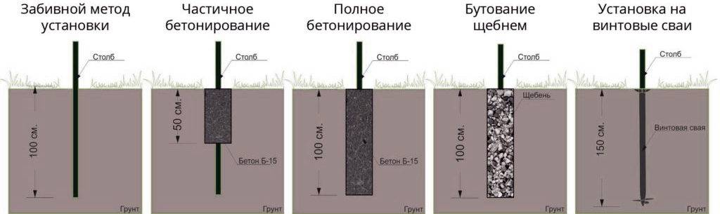 В зависимости от перечисленных параметров можно выбрать один из видов установки столбов: