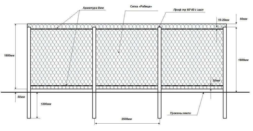 Расстояние между ними будет зависеть от размера сетки. Если она приобретается в рулоне, то промежуток между столбами должен быть равен 5 метрам. Ведется расчет материала, который понадобится для монтажа.