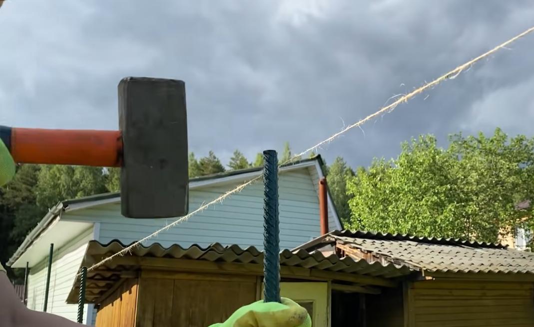 - Установка столбов. Для них применяют металлические или пластиковые трубы диаметром 15-20 мм. Опоры вбивают в почву на глубину 1 м. Исходя из этих данных и высоты забора, определяют длину труб. Столбы необходимо жестко закрепить в строго вертикальном положении, что контролируется отвесом. Крайние опоры оснащают дополнительной распоркой под углом в 45 градусов. Можно также навешивать сетку на деревянный брус. Подземный участок труб покрывают антикоррозионным составом, а дерево пропитывают антисептиком.