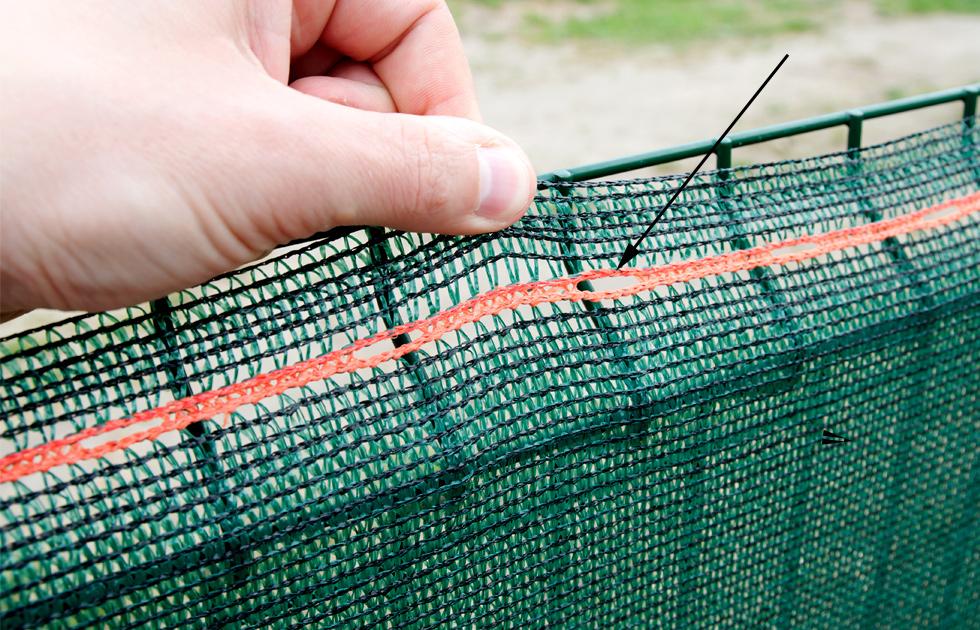- Монтаж сетки. В сформированном тросами и столбами прямоугольнике натягивают сетку. После натяжения она не должна иметь складок. Верхнюю часть располагают на 8–12 см ниже высоты опор, нижнюю – на 25 см выше уровня грунта. Для фиксации удобно использовать пластиковые пластмассовые хомуты и люверсы (пластиковые зажимы). Шаг крепления для хомутов 30-40 см, а для зажимов – до 1,2 м.