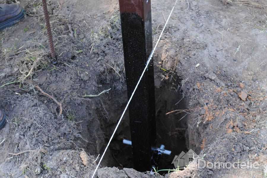 Нижняя часть деревянных опор обрабатывается защитным средством – битумным праймером или строительным битумом. Особенно тщательно обрабатывается торец столба. Высота обработанной части должна на 10-15 см быть больше глубины котлована.