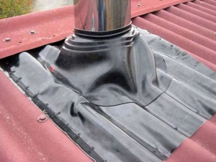 При обустройстве примыканий крыши к трубам, нужно быть аккуратными с битумными материалами, потому что они могут потечь от нагрева. Оригинальный Onduline имеет рецептуру, позволяющую выдерживать температуру больше 100 градусов Цельсия, но не выше 250 градусов. Поэтому вплотную листы к трубам не укладывают, оставляя зазор, примыкания закрываются специальными элементами из негорючих материалов или металла.