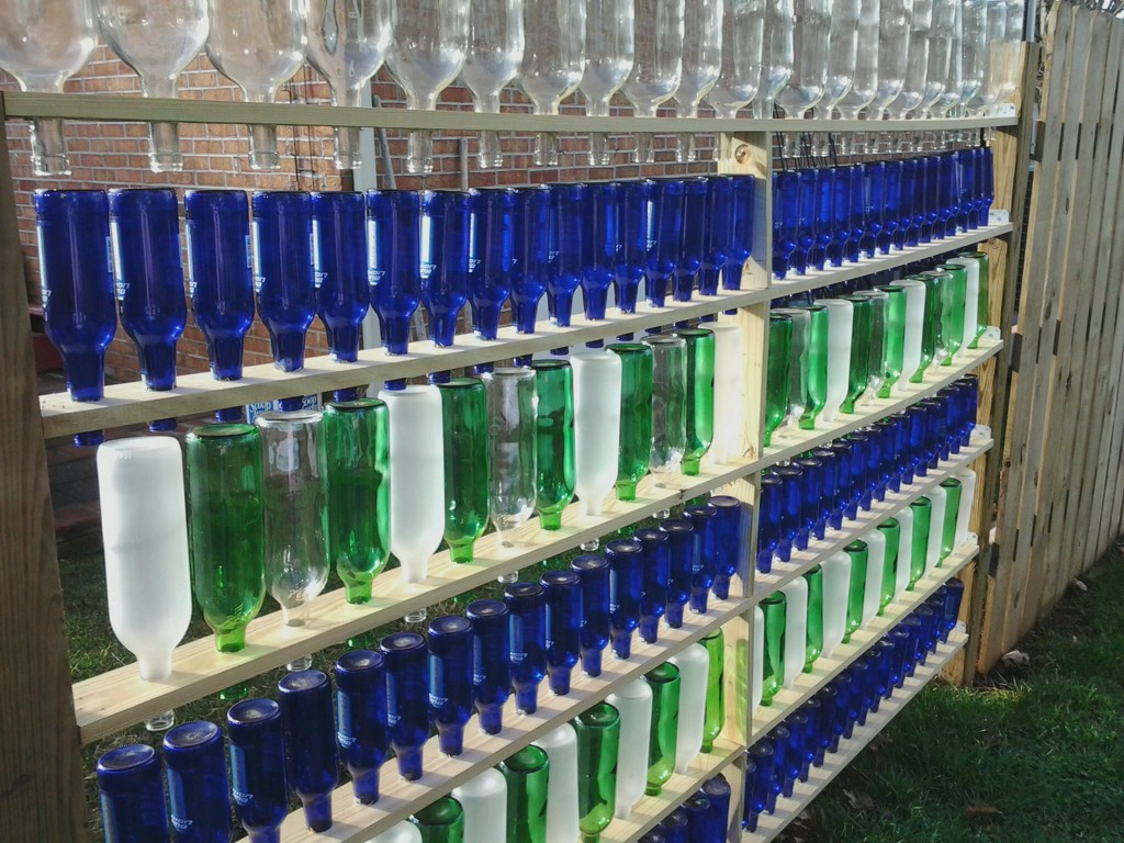 Гораздо больше простора для полета фантазии дает забор из стеклянных бутылок, выложенных методом «кирпичной кладки». Для его строительства понадобится большое количество бутылок и цементный раствор. Из инструментов пригодятся емкости для смешивания раствора, лопата, мастерок, уровень или отвес.