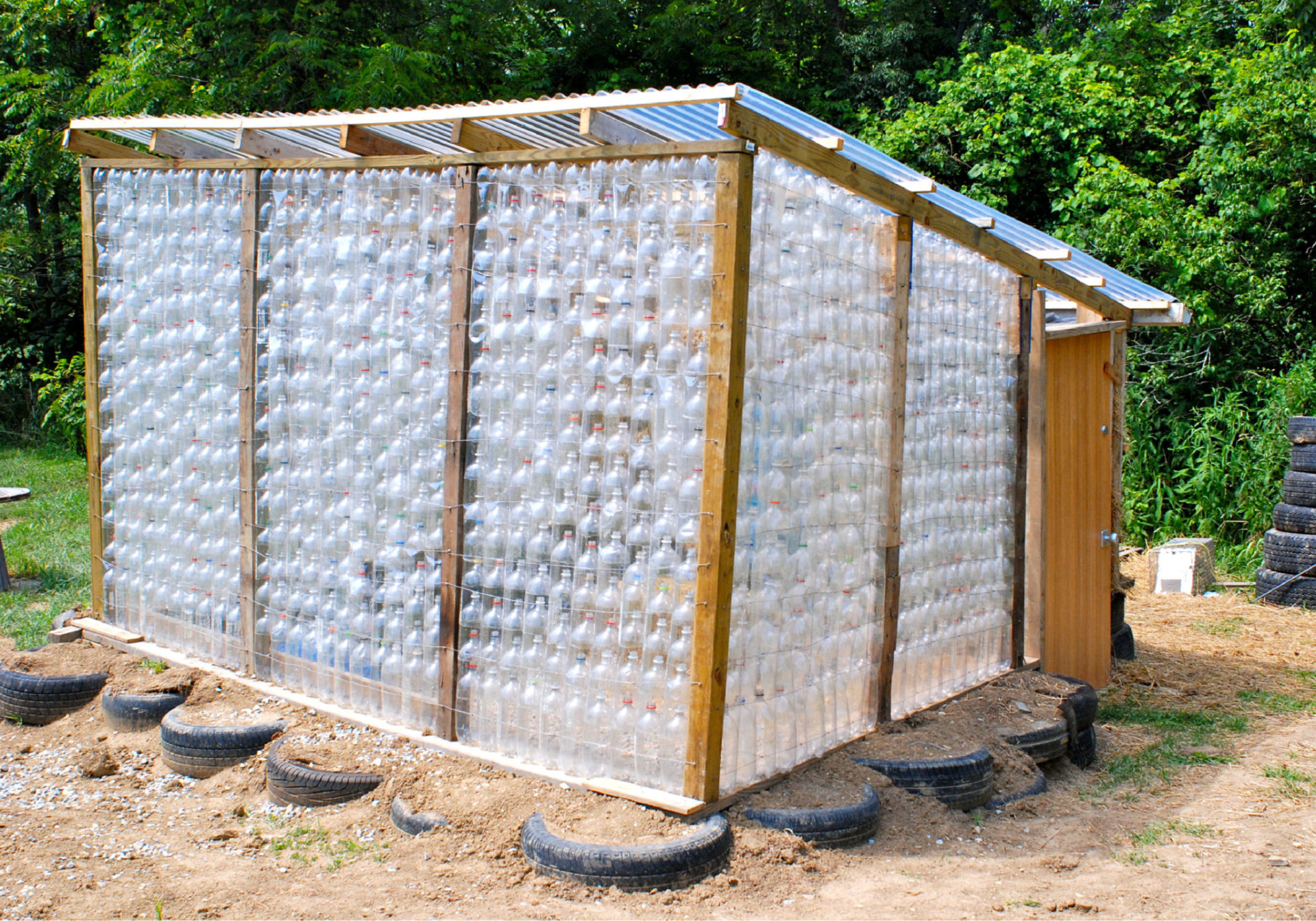 Из пластиковых емкостей – банок и бутылок — можно создавать не только заборы, но и другие строения, например, теплицы или беседки.