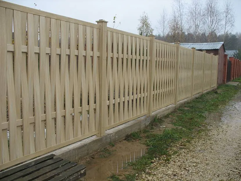 Решётчатая изгородь получается, когда к рейкам крепят перекладины. Они переплетаются под углом 90 градусов чаще всего. При желании возможно изменить угол. Опорами могут быть не только деревянные столбы, но и профильные трубы (6*8см).