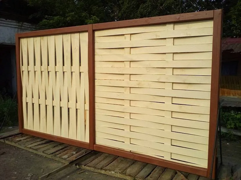 Чтобы уменьшить число стыков, плетенка, как правило, устанавливается горизонтально. Вертикальный вариант исполнения возможен, но для него потребуются дополнительные планки сверху и снизу. Они необходимы для удержания краев досок в конструкции.