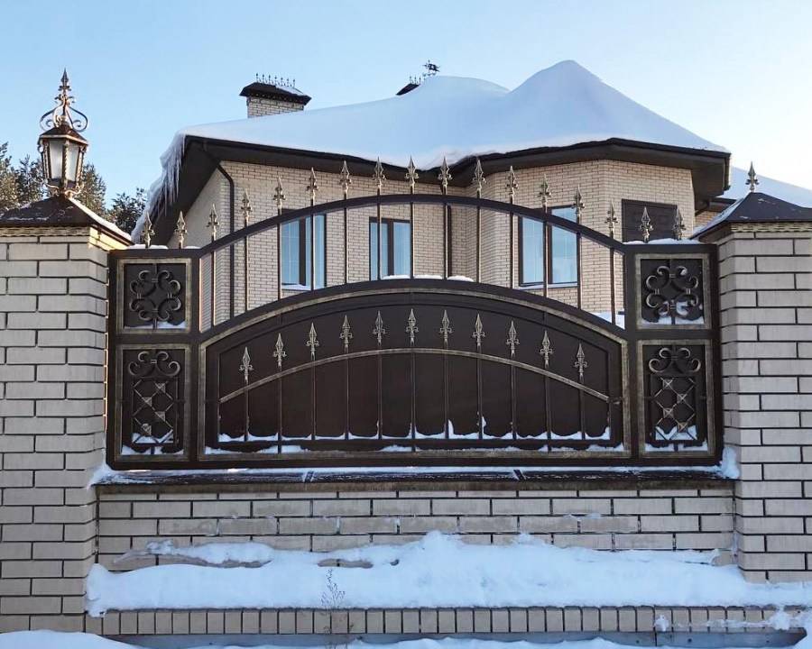 Сварные металлические заборы с элементами ковки можно назвать промежуточным продуктом между доступными сварными и дорогостоящими коваными заборами. Они изготавливаются из того же прута или различного металлопроката – швеллера, квадрата, уголков и включают лишь отдельные, изготовленные методом ковки, детали. К их преимуществам относят: