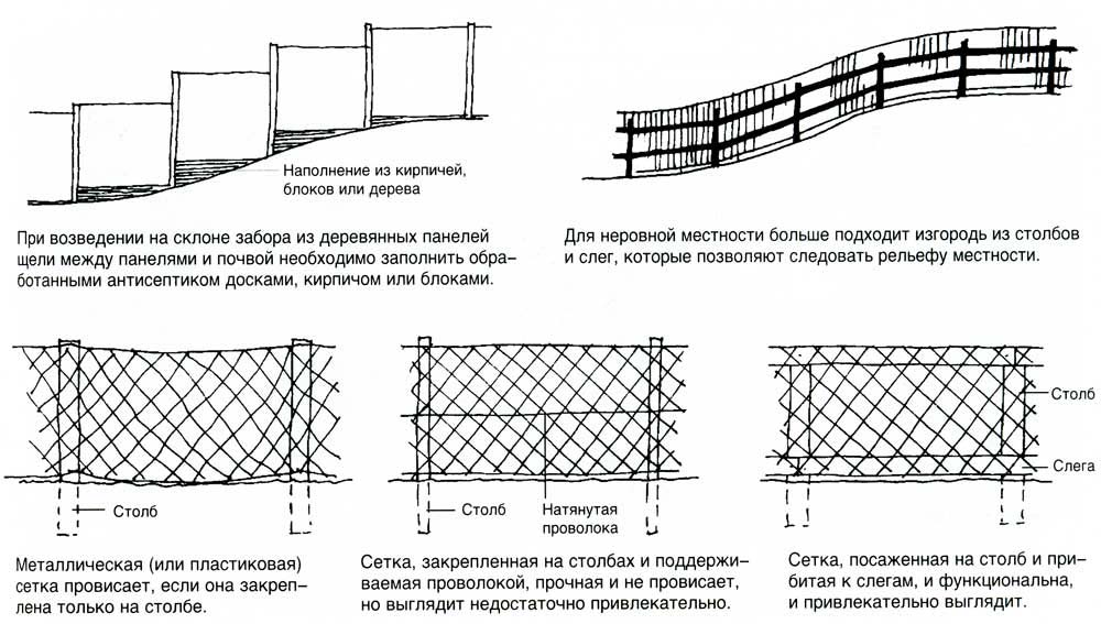 На заметку: можно оградить территорию с неровной поверхностью, установив ограду из камня, кирпича, дерева, но это будет более трудоемкий и финансово затратный процесс.