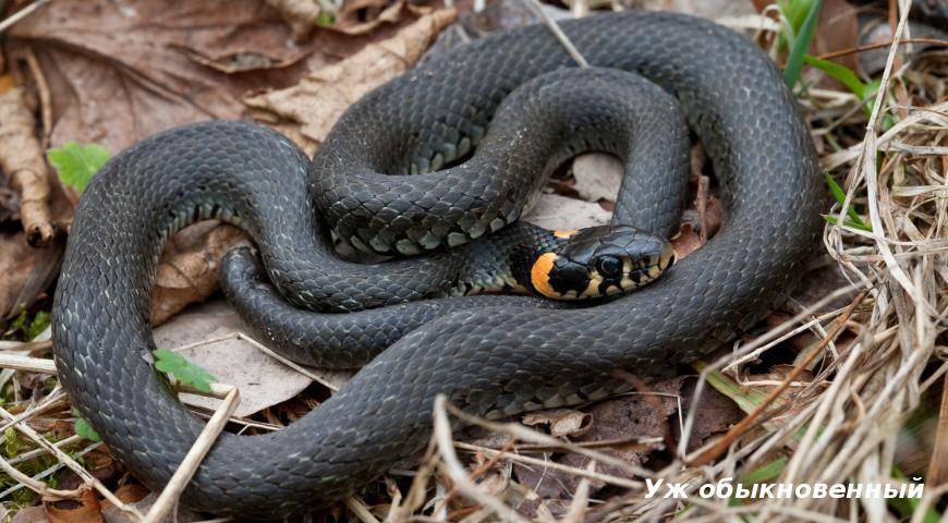 Ужи бывают довольно длинными, до 1,2 м. Окраска чаще всего черная, хотя встречаются бурые, серые и зеленоватые экземпляры. Брюхо намного светлее спины. Главная примета ужа – желтые или белесые пятна у основания головы. В редких случаях они могут быть почти незаметны. Гадюка имеет более скромную длину – до 70 см. Окраска змей разнообразна: зеленоватая, серая, черная и даже кирпичная, но для всех гадюк характерен зигзагообразный узор на спине и характерные Х-образные темные отметины на голове.