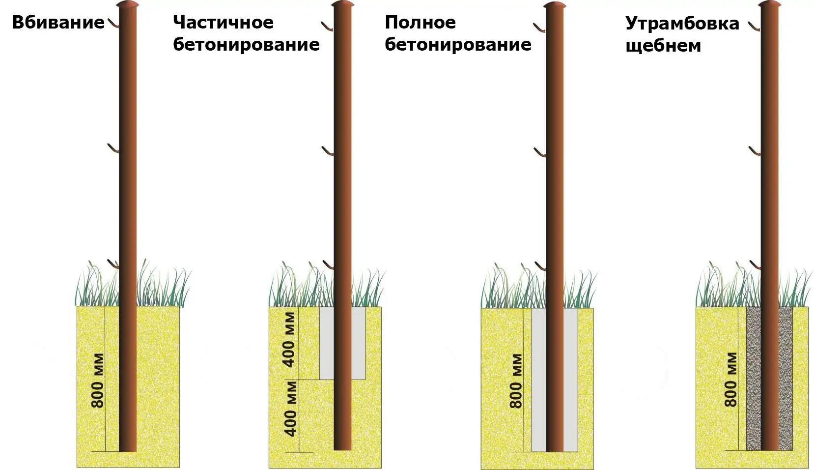 По периметру участка с помощью бура выкапывают ямки глубиной 1 м. Между лунками оставляют интервал 2,5 м. В отверстия устанавливают деревянные опоры. Пространство вокруг оснований опор заполняют битым кирпичом, цементируют.