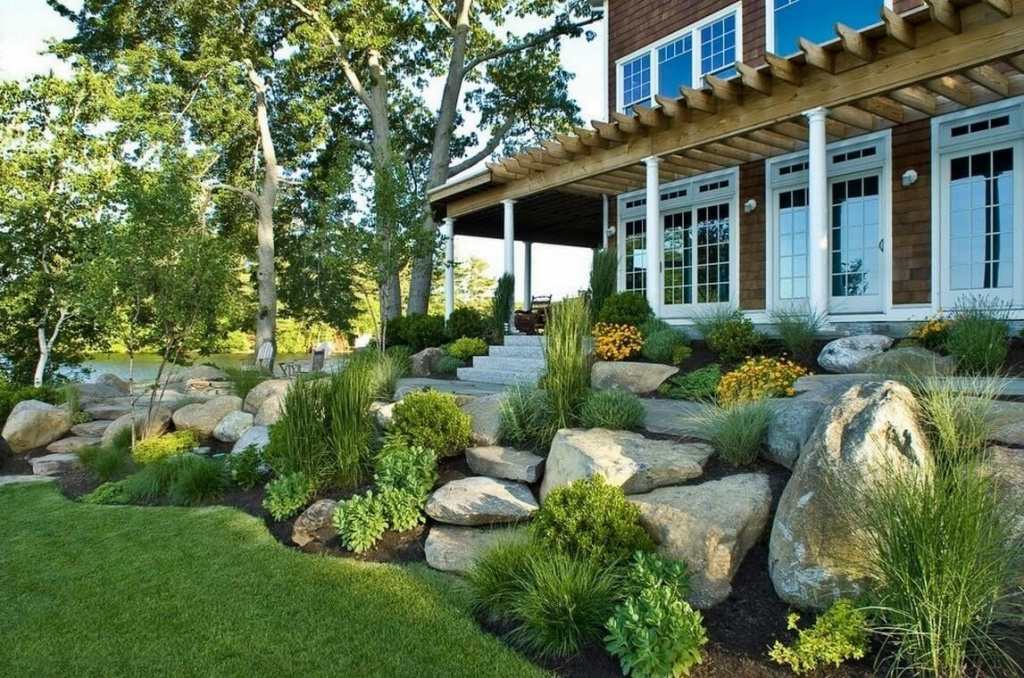 Валунами рекомендуется не только украшать сад, но и оснастить ими территорию около парадной двери. Разбросанные якобы небрежным образом большие камни помогут отобразить некоторые элементы культуры и стиля, которые присущи скандинавам.