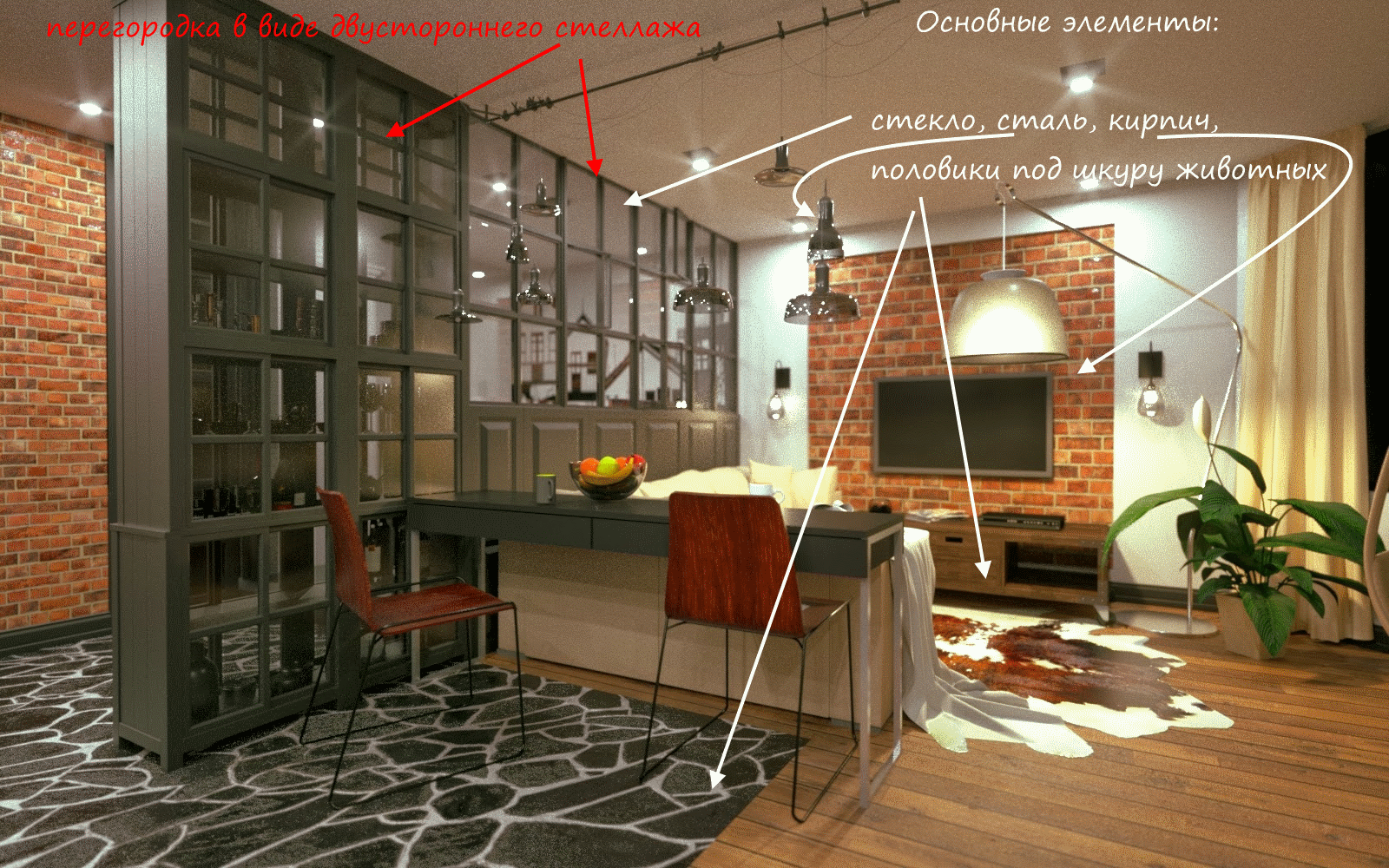 Обычно остаётся открытым вопрос о зонировании в этом стиле. Лофт-квартира – это открытое пространство, однако только спальни, санузлы и подсобные помещения изолируются. Для остального же используются приёмы зонирования.