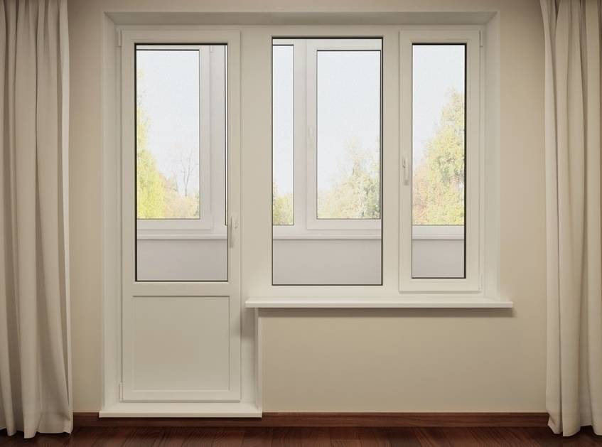 Бывают конструкции, которые состоят из двух стеклопакетов. Это обеспечивает больший приток света. В целом, в состав балконной двери входят элементы из стекла, металла и пластика.