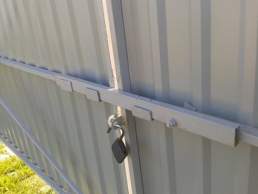 Сегодня популярны ворота, выполненные из профнастила. Все замки и запоры крепятся непосредственно к раме. Чтобы повысить безопасность своего участка для таких ворот стоит соорудить сдвижные накладные механизмы, крепящиеся к раме. При наличии распашных двустворчатых ворот каждая створка должна быть оборудована таким засовом.
