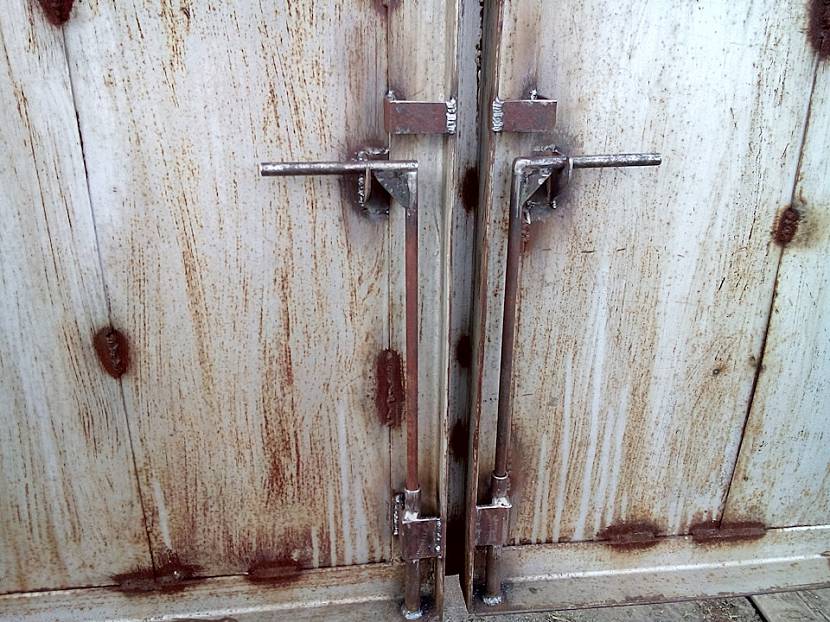 Также просто делают шпингалет. По краям створок приваривают петли, к одной из которых крепят язычок. Главное тут – чтобы язычок плотно входил в соседнюю петлю. Принято считать, что такой способ самый ненадёжный и более всего подвержен взломам и повреждениям.